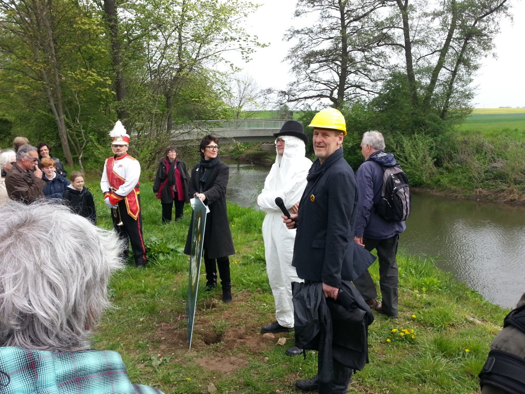 Andreas Platthaus referiert in weiß über die Vorzüge der Sondermann-Sternwarte; Dr. Hofmann (mit Helm) diszipliniert das Publikum.